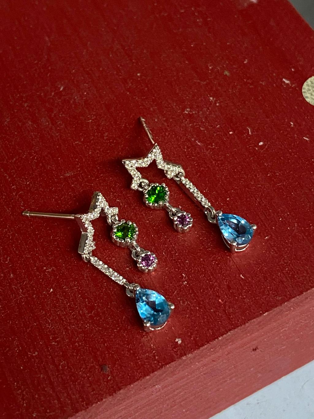 The Shooting Star Topaz earrings feature a star outlined in white diamonds, with topaz, green diamond, and pink diamond drops resembling a shooting star’s glowing trail. Topaz embodies sincerity and hope, symbolizing protection for wishes and the strength of dreams. Ideal for evening events, parties, or romantic occasions, they let you shine like starlight in motion.