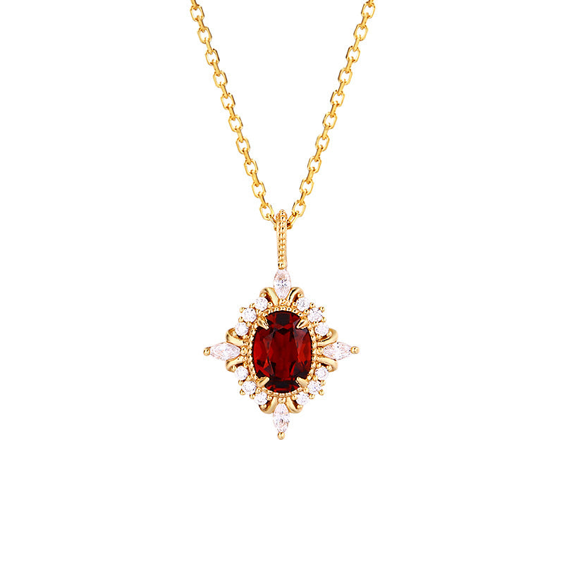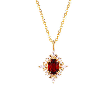 An oval garnet pendant rests at the center of a delicate chain, reflecting timeless vintage elegance. The saturated red gemstone draws attention without overwhelming the look, making it ideal as both a statement necklace and a layering necklace. As January birthstone jewelry, garnet adds emotional depth and personal meaning. A thoughtful birthday gift for her who appreciates classic gemstone pieces.