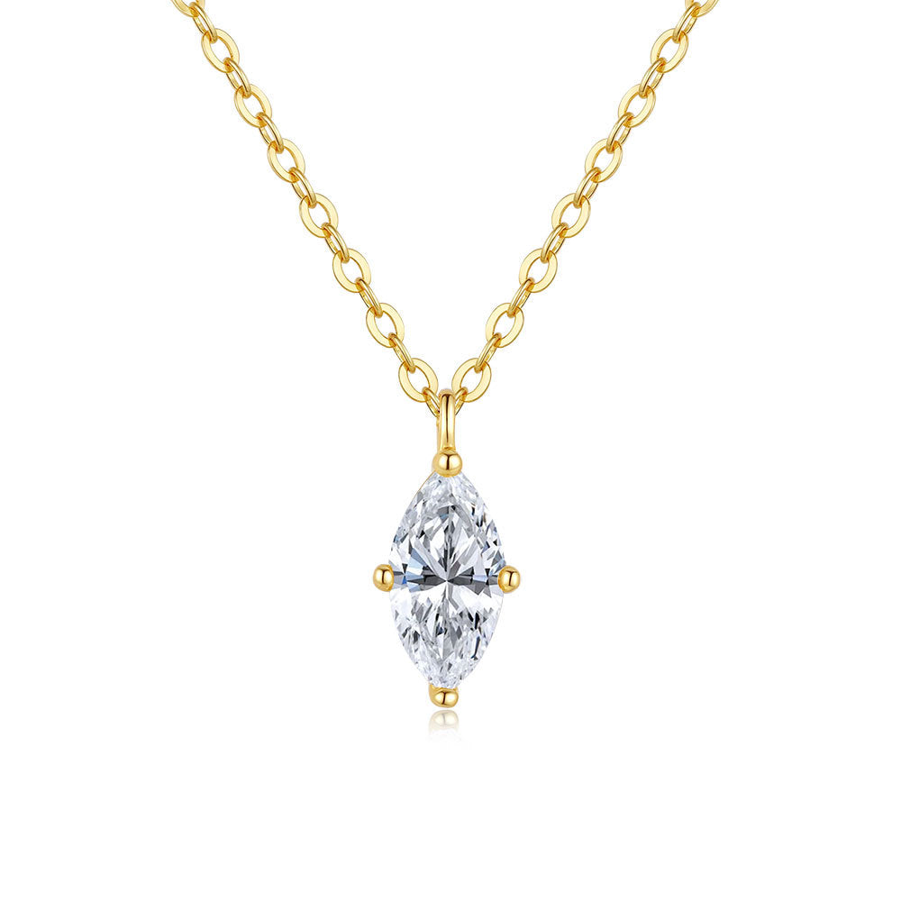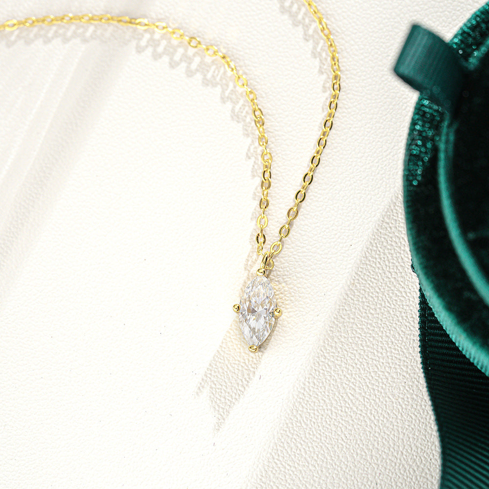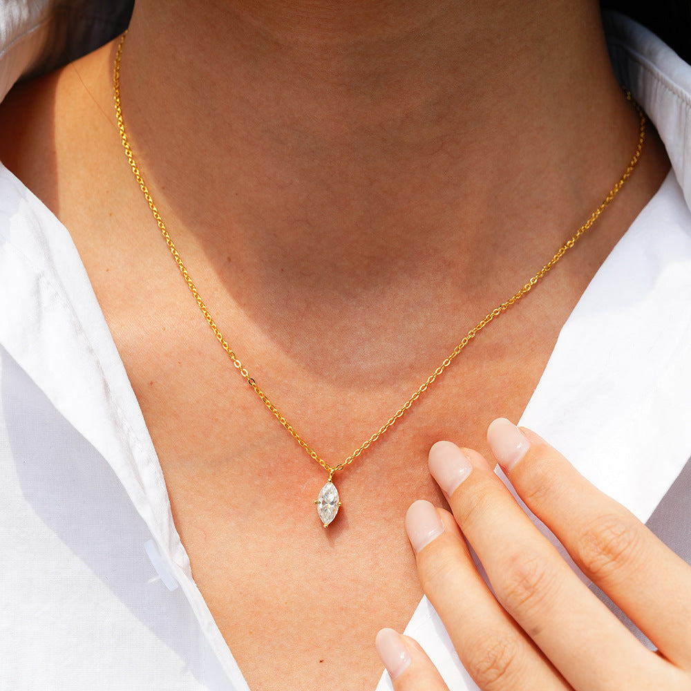 The Marquise Moissanite Necklace shines with a sleek, leaf-shaped silhouette that catches the light beautifully. Its bright moissanite sparkles with every movement, giving the piece a refined elegance that pairs effortlessly with both casual and formal looks. A lovely choice for anyone who adores sparkling jewelry, this fine jewelry necklace brings a touch of brilliance to everyday moments and makes a heartfelt gift for her when you want something meaningful and luminous.