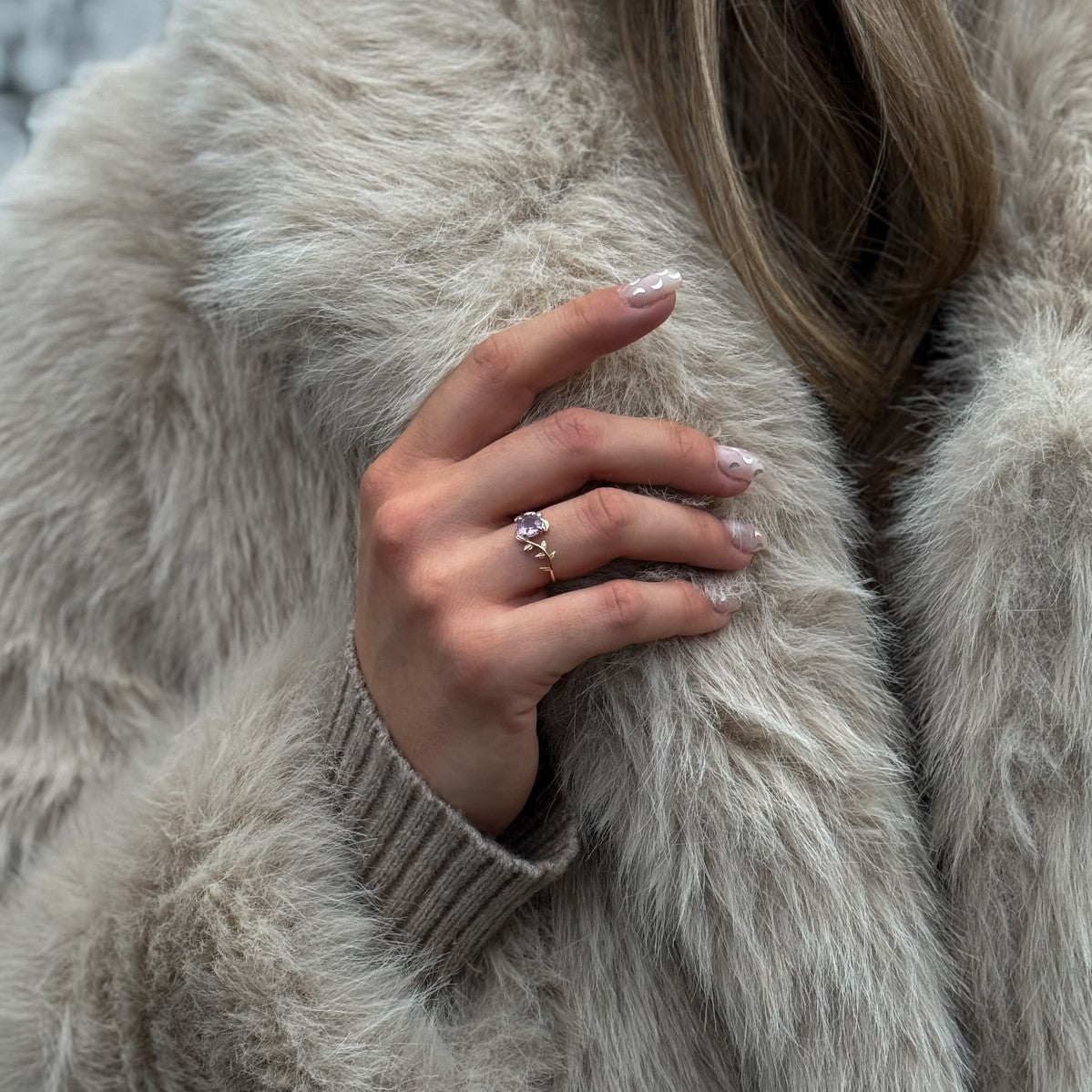 Inspired by nature, the Amethyst Leaf Ring is a stunning piece that will add a touch of elegance and beauty to any outfit. Made with a vibrant amethyst stone, each leaf design is unique and symbolizes growth and harmony. With this ring, you'll radiate confidence and grace.