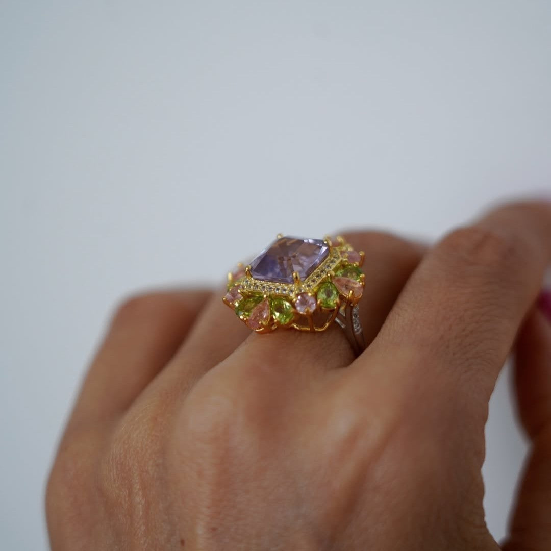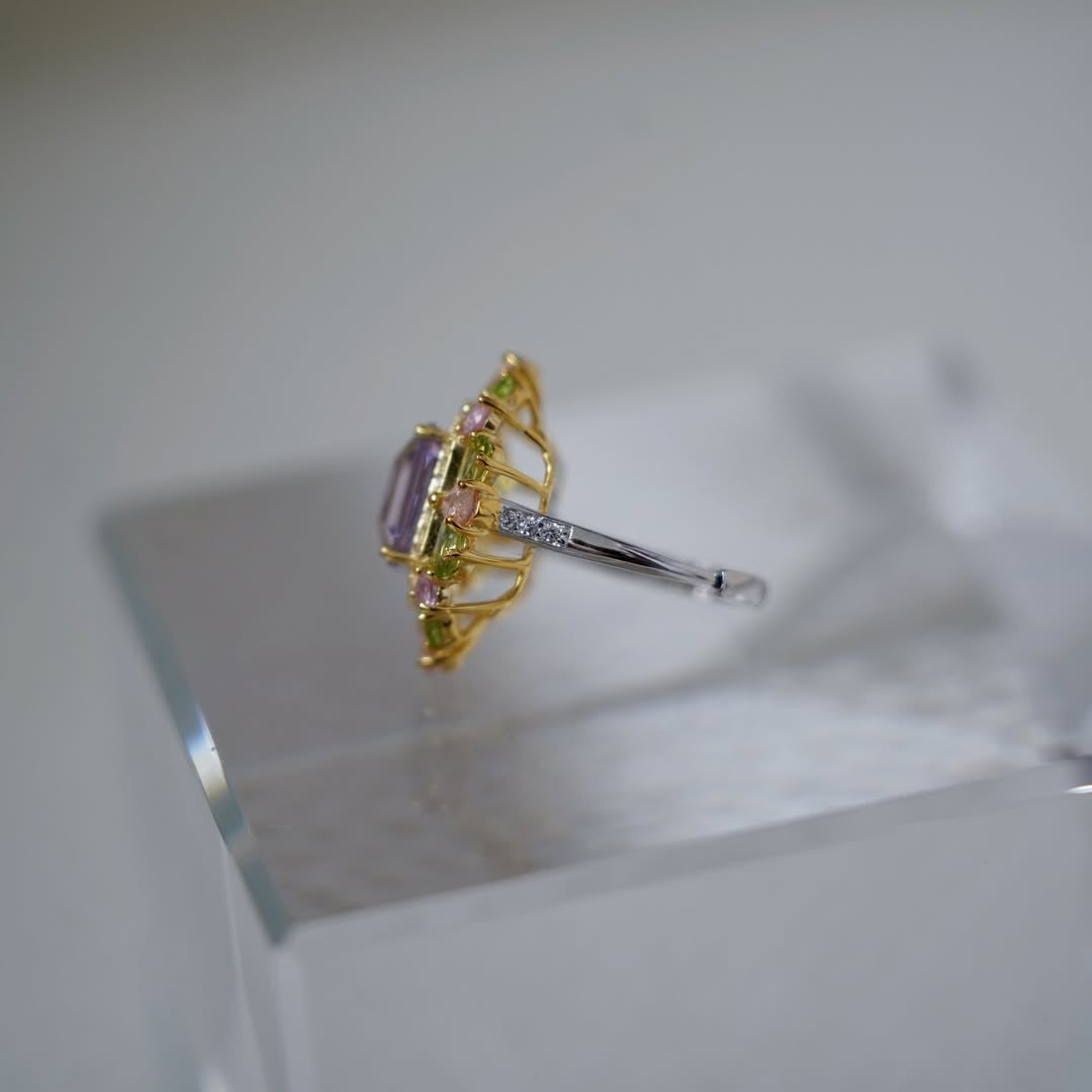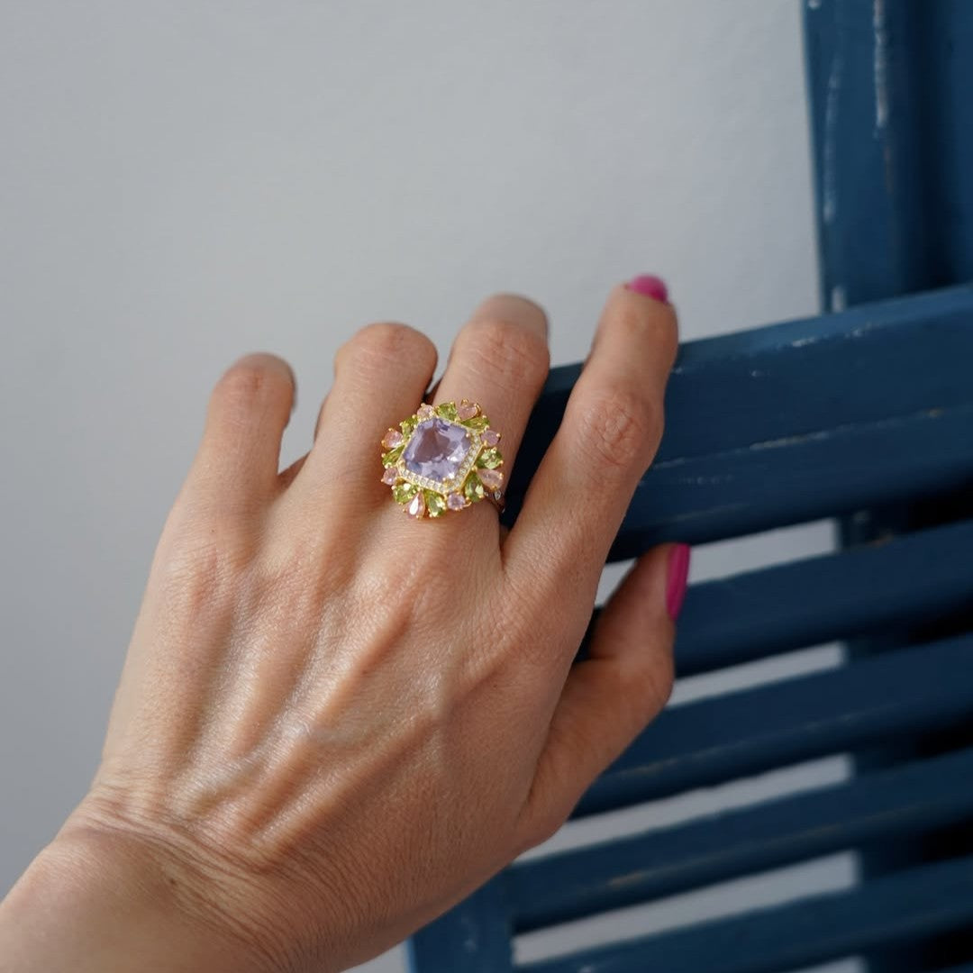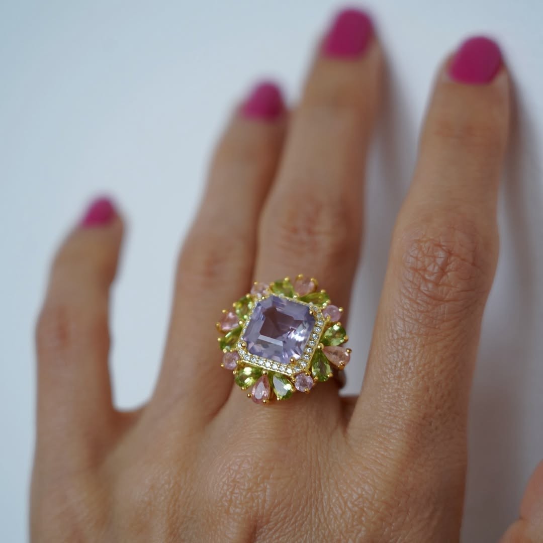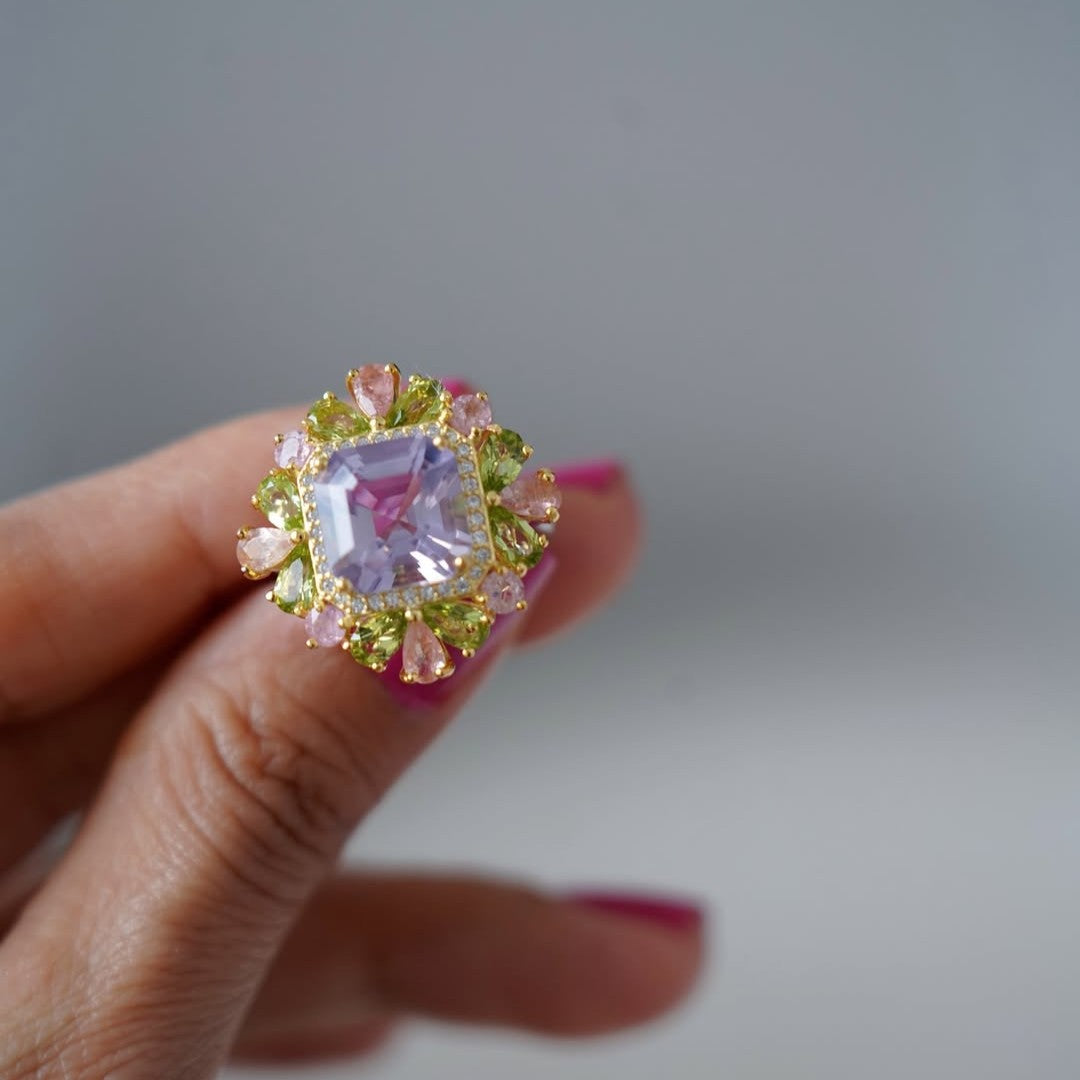 This beautiful Pink Tourmaline Peridot Ring boasts a stunning design that will make a statement with any outfit. The vibrant pink and green gemstones are sure to catch the eye, making this ring a unique and elegant addition to your jewelry collection.
