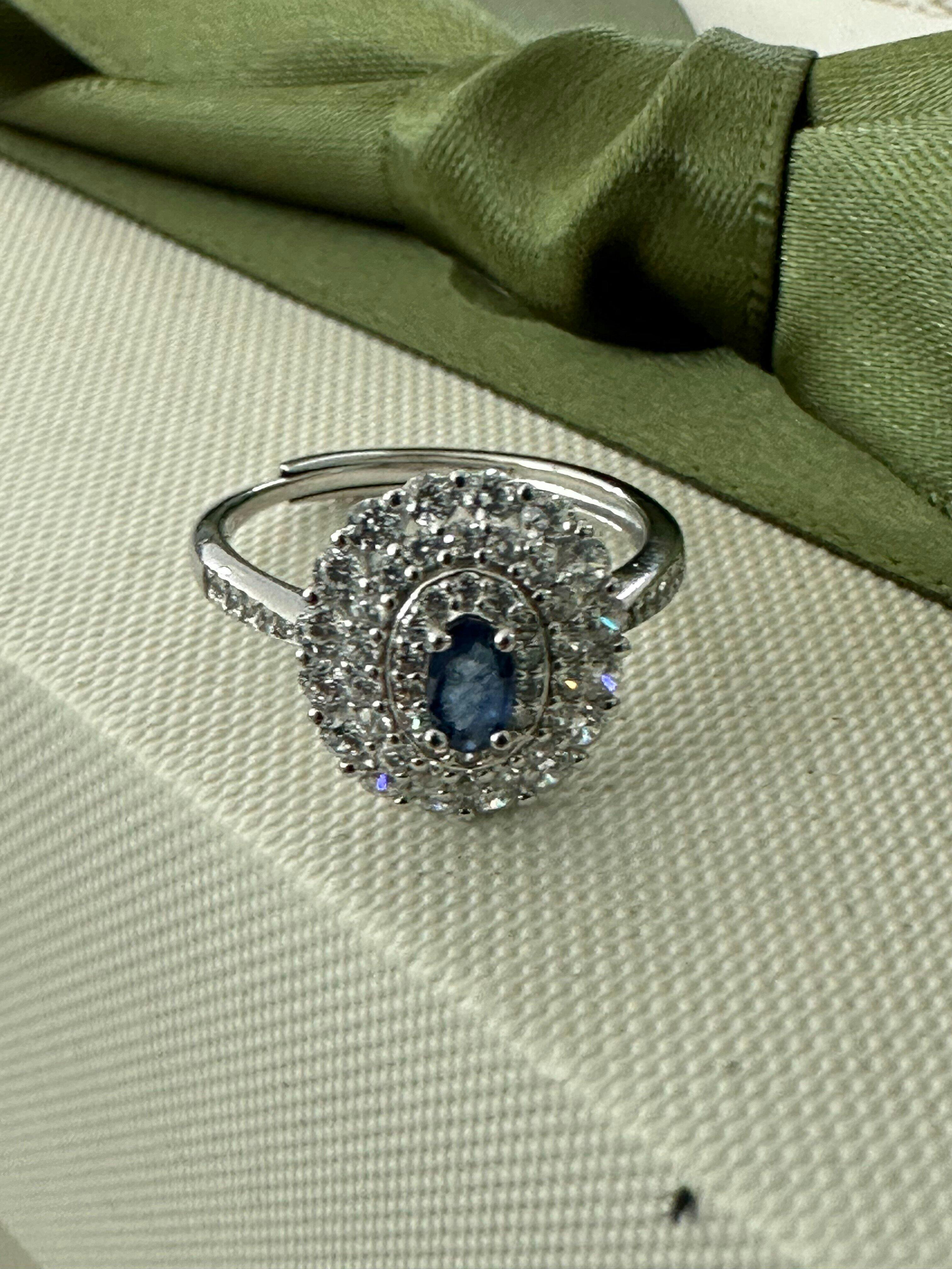 Graceful and timeless, this Sapphire Halo Oval Ring shines with the quiet elegance of classic beauty. The deep blue sapphire rests at the heart of a dazzling halo, creating a mesmerizing sparkle that captures every glimmer of light. Crafted in polished sterling silver, this halo engagement ring evokes sophistication and serenity — a perfect choice for those who appreciate fine gemstone jewelry with a modern yet regal charm.