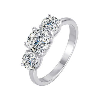 A quiet shimmer begins at the center of this three-stone ring, where a brilliant round moissanite sparkles like a wish held close to the heart. Two smaller stones rest beside it, glowing gently as if carrying yesterday’s memories and tomorrow’s hopes. Crafted in luminous sterling silver jewelry, this piece feels both timeless and romantic, a little treasure that catches the light with every move. A beautiful gift for her, it tells a story of love in three shining moments.