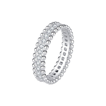 Experience effortless elegance with our Silver Bead Edge Row Diamond Ring. Expertly crafted with 28 shining Moissanites, this ring adds a touch of luxury to any outfit. Sparkling silver beads perfectly frame the brilliant diamonds, making this piece a timeless addition to your jewelry collection.