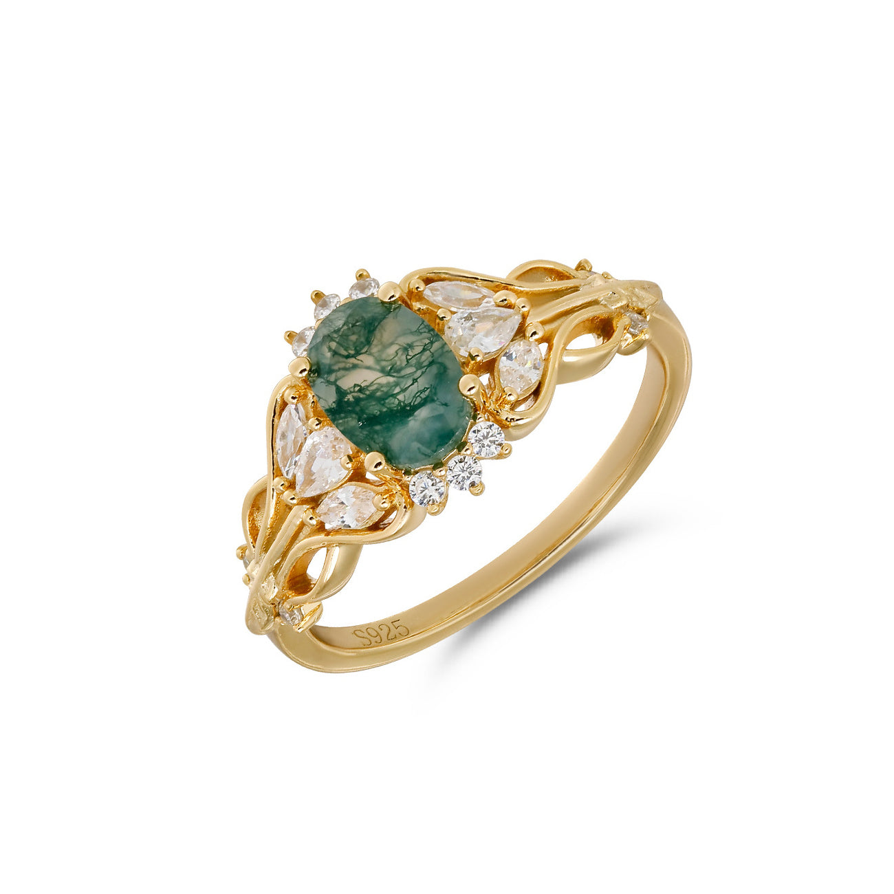 An oval moss agate rests within an airy hollow design, allowing light to pass through and highlight its unique natural inclusions. Elegant and lightweight, this moss agate ring brings a refined balance of vintage inspiration and nature jewelry beauty.